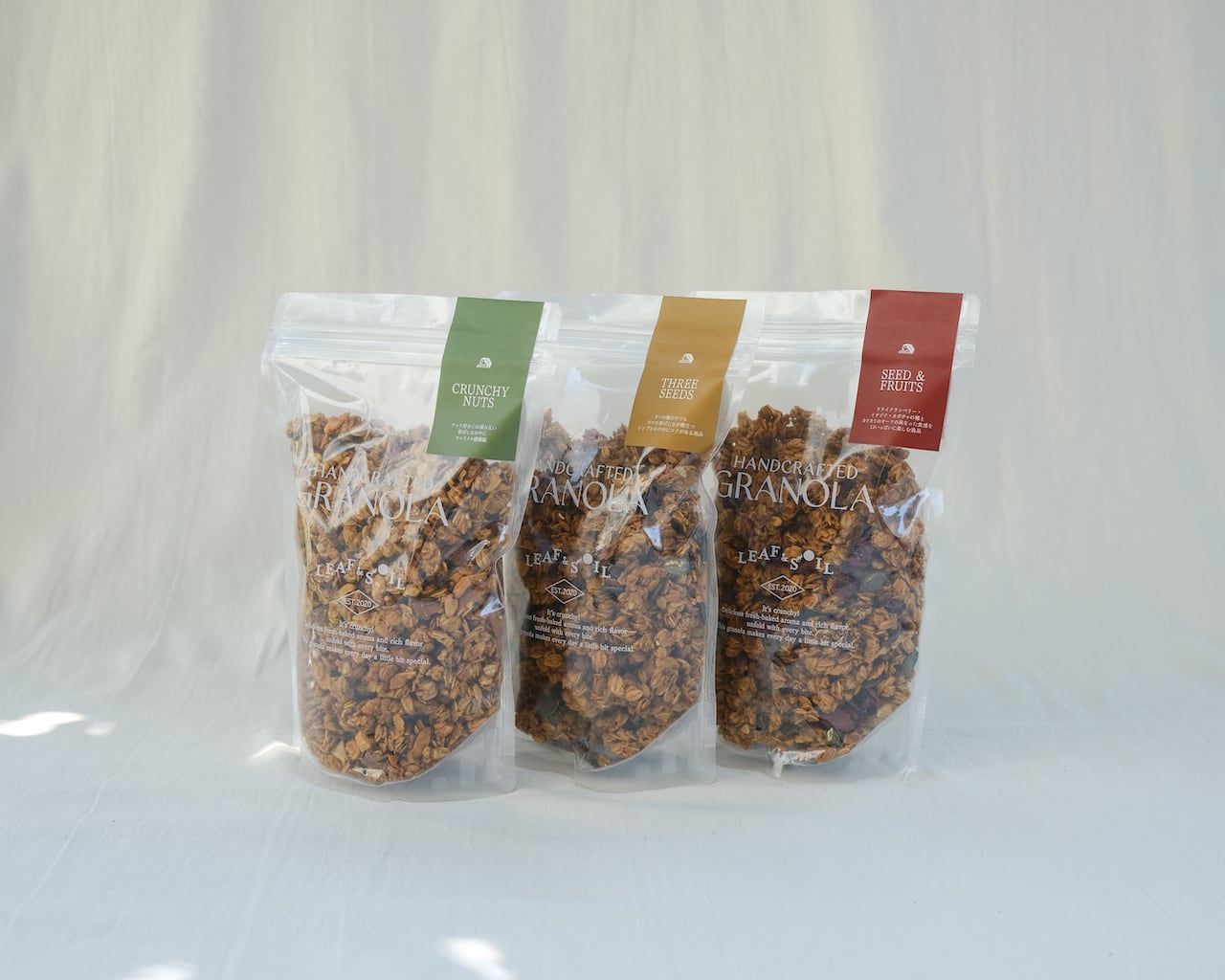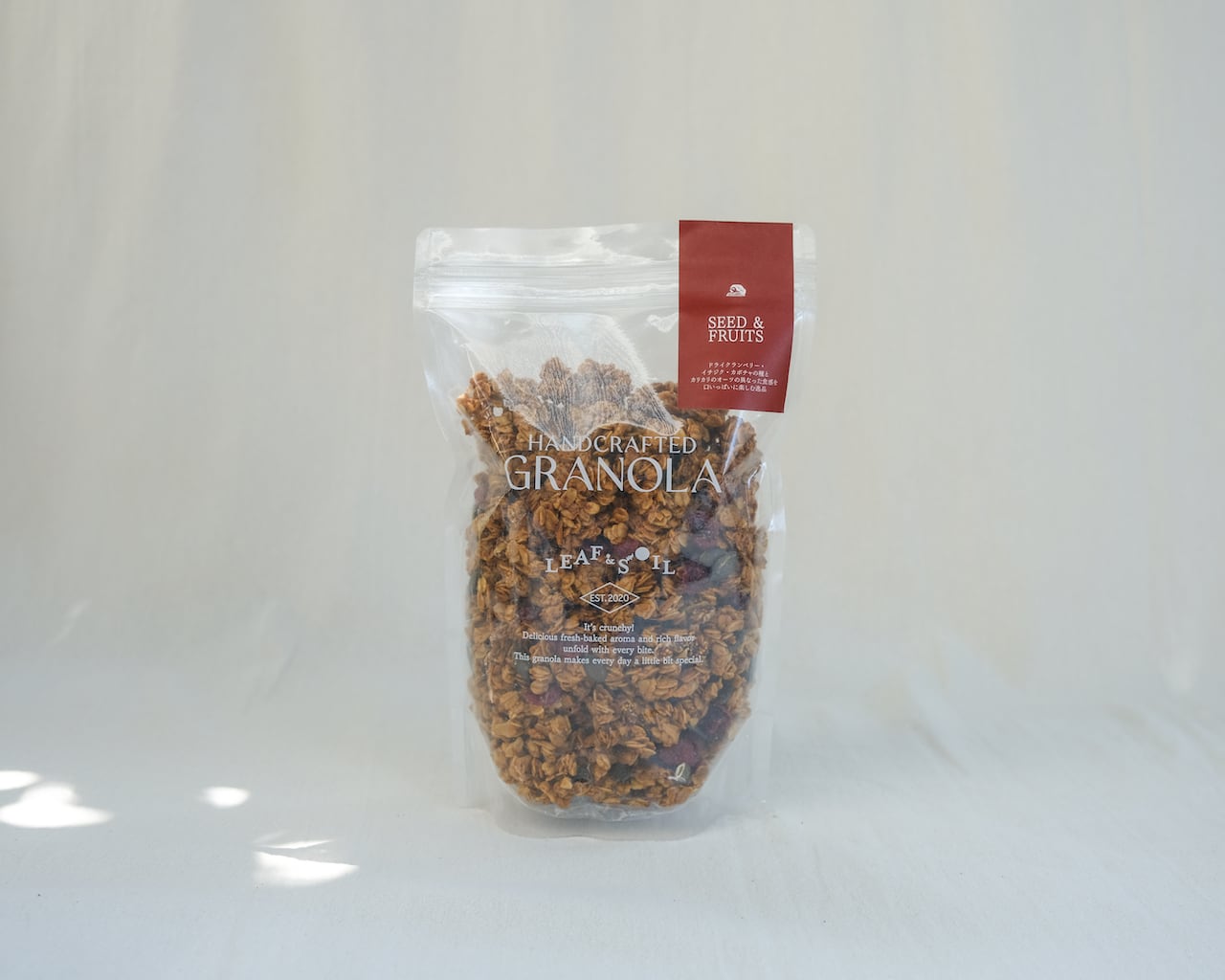 カラフルにしたかったので、赤いクランベリーに、緑のパンプキンシード、食感が楽しいドライフィグを入れています。製法は同じなのに全く別のグラノーラが完成しました。